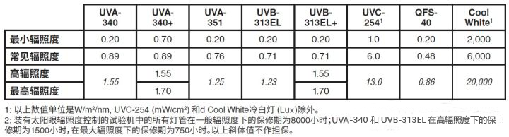 有太陽(yáng)眼輻照度控制系統(tǒng)的設(shè)備可以設(shè)定輻照度水平。例如, 對(duì)于 UVA-340燈管, 設(shè)定0.89W/m2@340nm的輻照度和夏天正午時(shí)光強(qiáng)相當(dāng)。為了更快地得到測(cè)試結(jié)果,紫外老化箱QUV可被設(shè)置在夏天正午光強(qiáng)200%條件下運(yùn)行?;诓煌瑹艄茴?lèi)型下表列出最高輻照度水平及一些常用的輻照度設(shè)置點(diǎn)。